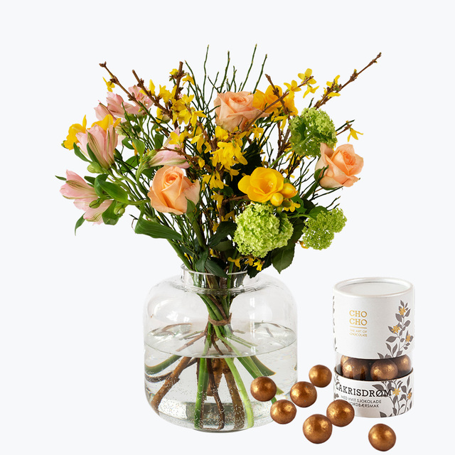 Vakker bukett med en herlig miks av vårens blomster i fargenyansene fersken, rosa, gult og syrlig vårgrønt. En flott hilsen som passer til alle anledninger og vil spre blomsterglede til den heldige mottakeren. Buketten leveres sammen med deilige lakris kuler med smak av salt lakris og hvit sjokolade. Vis mer